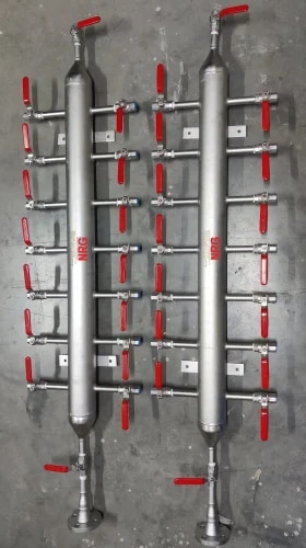 NRG GLOBAL MAKE air header distribution manifold has greater volume capacity that assists in handling fluctuation in air compressors. The air compressor header also provides a guaranteed full penetration weld. Coded weld and standard non-destructive tests are performed on these headers to check on the properties possessed by them. Festo air distribution manifold has 8 outlets that eliminate the need for complex multiple piping. High Pressure Air Header operates with 2 supply lines one of which is sealed with a blank plug to avoid damage when not in use. It is made up of die-cast aluminum which provides it the ability to resist corrosion and is light in weight. 6 way air header is used in the plastic processing, petrochemical industry, power generation, refineries, and chemical industries. 4 way air headers are said to be reliable and have a weldable body structure. They reduce the assembly and installation time. Air Header Manifold With Needle Valve has flang and threaded inlet options. Air Header With Flange End can be further coated with zinc depending upon the requirement of the customer. Air Header With Ball Valve is used in shipping and marine, oil and gas, and various other industries